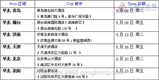 場次安排: 青島|煙臺|濟南|天津|北京|沈陽|長沙|武漢|鄭州|西安|成都|深圳|廈門 起止時間: 2008-04-09 至 2008-05-31