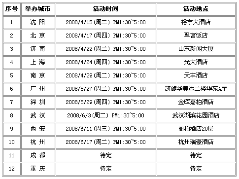 場次安排: 沈陽 2008.4.15|北京 2008.4.17|濟(jì)南 2008.4.22|上海 2008.4.24|南京 2008.4.29|廣州 2008.5.27|深圳 2008.5.29|武漢 2008.6.3|西安 2008.6.11|杭州 2008.6.17|成都 待定|重慶 待定| 起止時間: 2008-03-31 至 2008-06-17