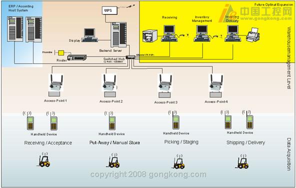 現(xiàn)場操作人員可以使用PDA或帶網(wǎng)卡的筆記本來實時進入物流配送網(wǎng)絡,監(jiān)控庫存,并對運輸環(huán)節(jié)發(fā)出指令,遠程控制RGV或AGV小車將貨物運送到某個貨庫或貨架中。