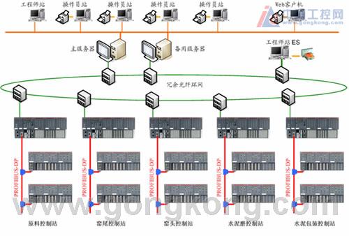 水泥生產(chǎn)的各個控制站極為分散,此時系統(tǒng)的安全很大程度上取決于控制網(wǎng)絡(luò)的穩(wěn)定性。冗余光纖環(huán)網(wǎng)技術(shù)的設(shè)計與采用使得過程控制網(wǎng)絡(luò)極為可靠,大大提高了整個系統(tǒng)的安全系數(shù)。