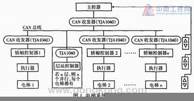 基于C167CS 微控制器設計了數字化電梯系統, 該系統中利用多規則加權的模糊控制算法進行群控控制,以CAN總線多主方式實現各控制器間的串行通信。 該系統提高了電梯的運行效率,并增強了電梯運行的實時性控制,系統的靈活性與可靠性得到了提高。 1 引言 國民經濟的飛速發展, 現代化程度日益提高,高層建筑愈來愈多, 電梯也隨之增多, 電梯產品在人們物質文化生活中的地位得到了提高,成為重要的運輸設備之一。國內傳統的電梯控制一是由繼電器、接觸器構成。它不僅存在著可靠性差、成本高、故障率高等缺點,而且在層數增加時,配線變化給制造及安裝帶來諸多不變。若用微機來控制電梯具有許多優點,進而數字化電梯控制系統是發展的必然。數字化最大的優點之一是在信號的傳輸方面, 而且同時也將交換的功能聯系在一起, 視頻信號、音頻信號、計算機數據都利用0、1 二進制代碼在同一網絡里傳輸和交換,這種以數字化為共同語言彼此相容和溝通的特性,使各種形式的信息傳輸速度大大加快,使得整個系統更加有效。本文旨在開發數字化電梯系統。 2 系統的總體結構 本系統中,以C167CS微控制器為基礎,開發了數字化電梯系統。整個系統的結構如圖1所示。它主要包括主控器、轎廂控制器、層站控制器、通訊模塊及廳外呼叫部分。
