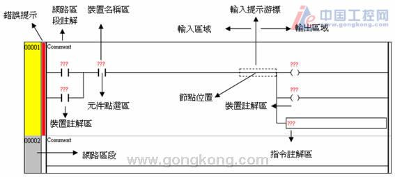 為方便切換階梯窗口,只要點選系統信息列中的樹枝狀對應的程序編號,自動切換對應的程序編輯窗口,在PMSoft編輯環境中同時只能有一個階梯圖窗口,這是為了在龐大復雜程序中找尋程序方便,同時將主程序、運動子程序、一般子程序這三種程序模塊化處理,O100主程序只有一個編輯窗口,Oxn運動程序有100個編輯窗口,Pm子程序有256個編輯窗口,總共有357個窗口,每個窗口未編輯都有10 network。程序編輯由網絡區段組成,每個網絡區段是由輸入與輸出編輯區域所組成,在編輯過程中,自動產生邏輯結構正確的階梯圖,使用者無須再做額外補線的動作,網絡區段編輯并具有錯誤提示功能。