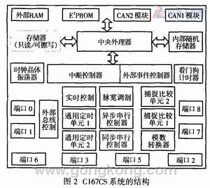 主控器:是指控制相應(yīng)電梯運(yùn)行的控制器。它負(fù)責(zé)與各轎廂控制器、層站控制器相互通訊, 并發(fā)送控制指令來控制相應(yīng)電梯的運(yùn)行。通過采集到的各個電梯的狀態(tài)及廳外呼叫來決定指派最優(yōu)的電梯來進(jìn)行工作。主控器控制變頻器進(jìn)行調(diào)速控制; 接收旋轉(zhuǎn)編碼器的輸出的脈沖信號, 作為速度反饋信號; 具有RS-232接口, 以與其它設(shè)備相聯(lián)接,以進(jìn)行電梯的監(jiān)控與調(diào)試。 轎廂控制器: 它控制單個電梯的運(yùn)行, 并將電梯的運(yùn)行狀態(tài)及時傳送到主控器,以便主控器發(fā)送指令來控制整個系統(tǒng)的運(yùn)行。 層站控制器: 采集樓層召喚信號, 控制按鈕燈的輸出,并以滾動方式顯示方向和樓層。基站的樓層控制器增設(shè)鑰匙開關(guān)、消防運(yùn)行開關(guān)輸入功能,以實(shí)現(xiàn)電梯的開/ 停和消防運(yùn)行,并通過CAN端口與總線相連接。 通訊模塊: 采用CAN總線多主結(jié)構(gòu),來實(shí)現(xiàn)電梯主控器、層站控制器、外呼和轎廂之間控制信號的串行通信。 廳外呼叫及顯示:在電梯的每層廳外都有呼叫選擇部分, 它代表乘客的乘梯方向(如向上或向下) ,并給予相應(yīng)的LED 顯示。 系統(tǒng)工作原理: 各個轎廂控制器及層站控制器將采集到的信號發(fā)送到CAN總線, 主控器根據(jù)這些信號及相應(yīng)的群控算法選擇最優(yōu)的電梯進(jìn)行響應(yīng),結(jié)合專用線路上的安全信號、旋轉(zhuǎn)編碼器脈沖信號等發(fā)出選層、定向、變速和平層等指令, 控制轎廂的運(yùn)行及門機(jī)的動作, 并將轎廂的位置信號發(fā)送到CAN總線上。顯示模塊則相應(yīng)地進(jìn)行LED顯示。在數(shù)字化電梯系統(tǒng)的設(shè)計(jì)中關(guān)鍵部分是主控器中的群控算法及CAN總線通信的實(shí)現(xiàn), 下面詳細(xì)介紹此兩部分的具體實(shí)現(xiàn)。 3 C167微控制器介紹 C167 單片機(jī)是80C166 系列中的一款高性能的微處理器。CPU時鐘頻率最高可達(dá)40MHz , 片內(nèi)ROM128K/256 K,片內(nèi)RAM11K,尋址能力16M。采用4 級流水線,有56個中斷(16個優(yōu)先級) ,外設(shè)事件控制器PEC ,32 通道比較/ 捕捉單元,2 個通用定時器單元, 以及4 通道的PMW。多通道10位的A/D轉(zhuǎn)換口,C167的I/O 接口多達(dá)111個,其串行I/ O接口有同步/異步接口UART、高速同步接口SSC。同時擁有CAN總線通信控制器模塊, 可以支持高速串行通信協(xié)議CAN2.0B , 即支持標(biāo)準(zhǔn)(11位ID) 和擴(kuò)展(29位ID) 的通信協(xié)議。可編程外部總線可對不同地址范圍進(jìn)行不同的設(shè)置。 C167 單片機(jī)的集成度高、功能多、性能強(qiáng)。C167單片機(jī)的品種也比較多, 比如C167S、C167CR、C167CS等,這些單片機(jī)的I/O基本功能是相同的, 都是111根引腳, 只是片內(nèi)RAM以及ROM大小有所不同。本文采用的單片機(jī)型號是C167CS, 圖2 所示為C167CS的結(jié)構(gòu)圖。