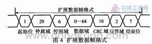 對于n 部電梯,則有n 個輸出值Y1 ,Y2 ,. . . . . . , Yn , 而最終系統(tǒng)選擇max(y i) { i = 1 , 2 , . . . . . . , n} 作為輸出,即選派此電梯來響應(yīng)召喚。選擇各個參量相應(yīng)的隸屬度函數(shù)和輸出參量的隸屬度函數(shù)及相應(yīng)的權(quán)值,經(jīng)過模糊算法即可實(shí)現(xiàn)電梯的調(diào)度。 4. 2 CAN通訊的實(shí)現(xiàn) CAN 是一種新型的總線式串行通信網(wǎng)絡(luò),具有突出的實(shí)時性、靈活性和可靠性等優(yōu)點(diǎn), 可以很好地解決通訊問題。CAN通信具有如下的特點(diǎn):CAN網(wǎng)絡(luò)上的任一節(jié)點(diǎn)均可在任意時刻發(fā)送信息,同時接收總線上的信息,無主從之分; 網(wǎng)絡(luò)上的節(jié)點(diǎn)信息分成不同的優(yōu)先級,可滿足不同的實(shí)時要求, 當(dāng)多點(diǎn)同時向總線發(fā)送報(bào)文時,優(yōu)先級較低的節(jié)點(diǎn)會主動退出發(fā)送,而優(yōu)先級高的節(jié)點(diǎn)可以不受影響地繼續(xù)發(fā)送數(shù)據(jù),大大節(jié)省了總線沖突仲裁時間,增強(qiáng)了網(wǎng)絡(luò)的實(shí)時性; 采用短幀傳送, 每幀信息都有CRC校驗(yàn)及其他檢錯校驗(yàn),可靠性高,直接通信能力可達(dá)最遠(yuǎn)10 km,速度可達(dá)1 Mbit/ s。可見,由于CAN的多主結(jié)構(gòu)在實(shí)時性、靈活性、可靠性等方面具有的突出優(yōu)點(diǎn), 非常適合電梯呼梯信號的通信。 4. 2. 1 CAN接口設(shè)計(jì) 為了實(shí)現(xiàn)基于CAN的數(shù)據(jù)通信, 必須將各控制器的輸入、輸出轉(zhuǎn)化為CAN標(biāo)準(zhǔn)。由于微控制器本身都帶有兩個CAN模塊,因此只需選擇CAN收發(fā)器即可。CAN總線的收發(fā)器采用 TJA1040 ,它是完全符合ISO 11898標(biāo)準(zhǔn)的控制器局域網(wǎng)CAN協(xié)議控制器和物理總線之間的接口, 速度可達(dá)1Mbaud。它有優(yōu)秀的EMC性能,而且在不上電狀態(tài)下有理想的無源性能,它還提供低功耗管理,支持遠(yuǎn)程喚醒。C167CS上的CAN模塊通過一條串行數(shù)據(jù)輸出線(CAN- TxD)和一條串行數(shù)據(jù)輸入線(CAN-RxD) 連接到收發(fā)器。而收發(fā)器則通過它的兩個有差動接收和發(fā)送能力的總線終端CANH和CANL連接到總線線路, 收發(fā)器使用5 V的額定電源電壓。 4. 2. 2 幀格式的形式 CAN的實(shí)際通信是由硬件來自動實(shí)施的,硬件是按信息幀格式(主要有數(shù)據(jù)信息幀和遠(yuǎn)程信息幀) 來傳遞數(shù)據(jù)的。總線傳送數(shù)據(jù)按信息幀來傳送, 幀與幀之間由3個分離位來分離, 沒有信息幀時,總線則處于空閑時間。數(shù)據(jù)信息幀的格式如圖4 所示(擴(kuò)展模式) 。