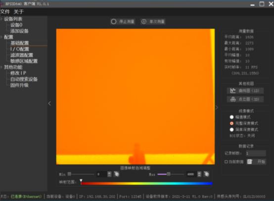 通過對定點距離1.5M測量,從上位機監測數據來看實際測量數據為1.55M,充分體現 HPS-3D640面陣固態激光雷達傳感器深度距離測量的高精度,對場景應用的準確性的強有力說明!