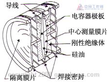 過程通過兩側或一側的隔離膜片、灌充液傳至&室的中心測量膜片。中心膜片是一個張緊的彈性元件,它對于作用在其上的兩側壓力差產生相應變形位移,其位移于差壓成正比,最大位移約0.1mm,這種位移在電容極板上形成差動電容,由電子線路把差動電容轉換成二線制的4-20mADC信號輸出。(見圖一)