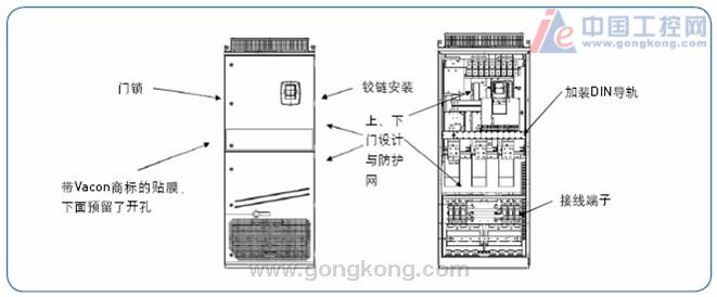 • 柜門上預留開孔,用于安裝用戶需要的指示燈與開關 (開孔由一個有VACON標識的貼膜覆蓋)