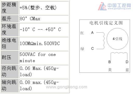步距精度 +5%(整步、空載) 溫升 80°CMax 環境溫度 -10°C -- +50°C 絕緣電阻 100MΩmin.500VDC 耐壓 500VAC for one minute 徑向跳動 0.06 Max.(450g-load) 軸向跳動 0.08 max.(450g-load)