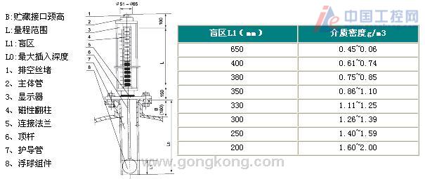 因測(cè)量時(shí)在結(jié)構(gòu)上存在一定的盲區(qū)值,讀數(shù)時(shí)要補(bǔ)償,對(duì)不同的介質(zhì)密度,浮球的長(zhǎng)度是不一樣的,故盲區(qū)值也不一樣,見(jiàn)表