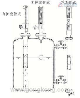 1、在容器從不適宜側(cè)面開(kāi)孔及容器周圍空間很少時(shí),可在容器上部或下部安排本形式的液位計(jì)。